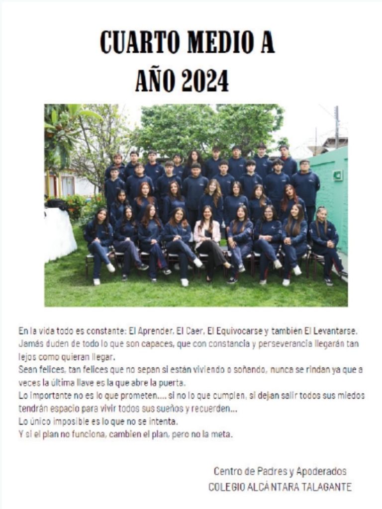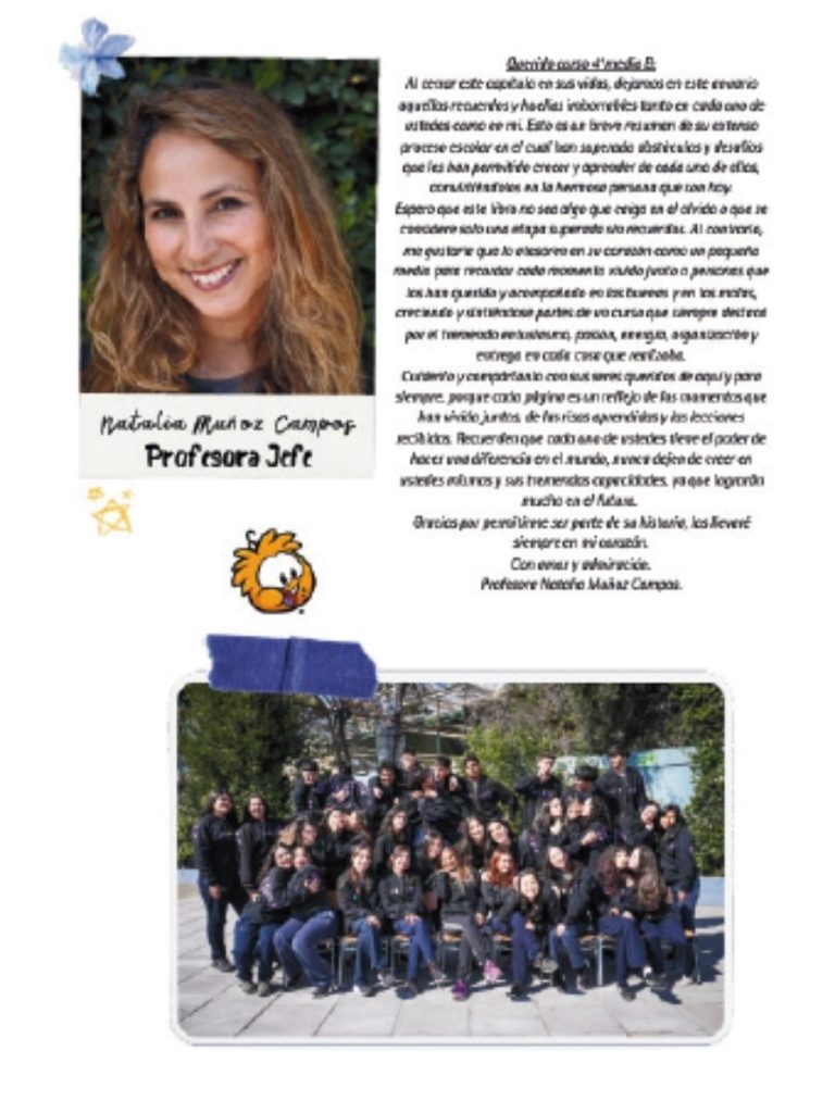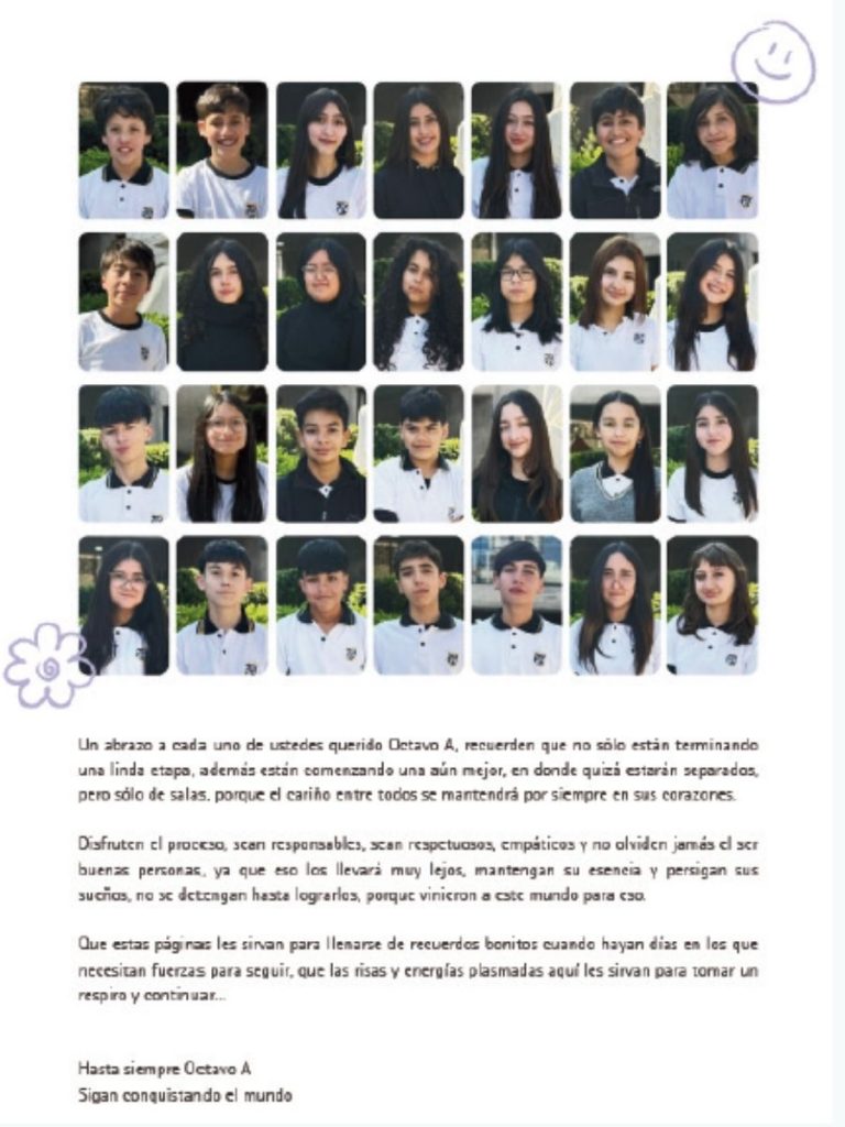 Muchos anuarios comienzan con una página que presenta al curso o generación, junto a una fotografía grupal y un pequeño mensaje.